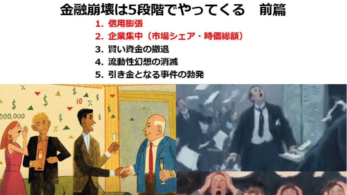 金融市場がどう崩壊するかについては、かなり定型化された経験則があります。必ず5つのステップを踏んでやってきて、しかも第1段階から第4段階まではどういう現象が起きるのかについて、具体的な実証データでもバックアップされた議論です。