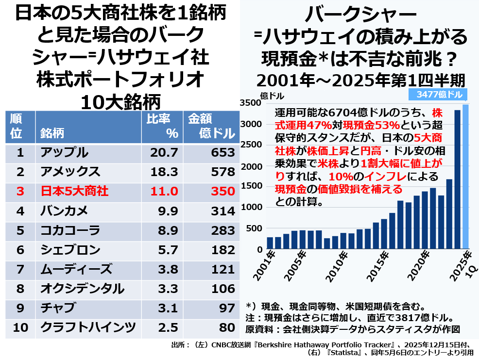 バークシャー・ハサウェイのポートフォリオ最上位10社と手元現預金の推移から、次の3点が浮かび上がってきます。