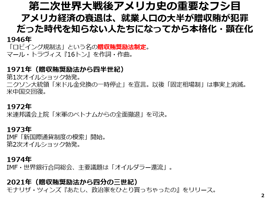 それより衰退が始まったのは第二次世界大戦直後と考えたほうがつじつまは合うという意味で、この年表は1946年の贈収賄奨励法制定を最大の屈曲点として、その後世代が交代するごとにますます悪くなっていったことをこれから論証するための道しるべ、とお考えください。