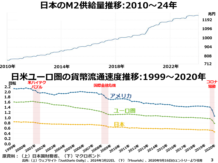 上段は日本のM2が800兆円弱から約1200兆円へと40%近い拡大となったことを示しています。