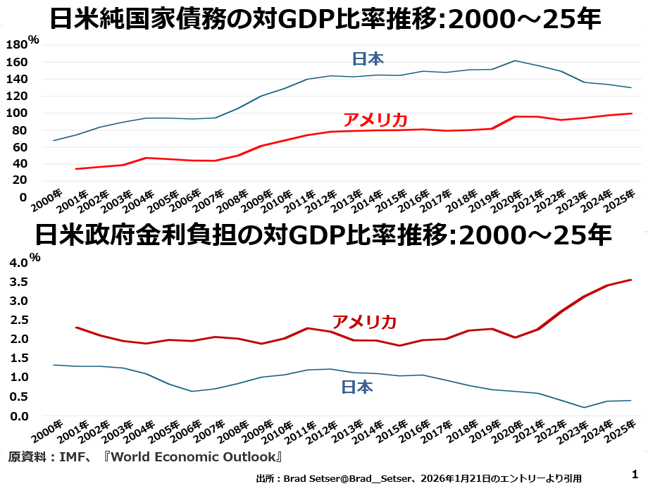 上段は日米の純国家債務を比較したグラフです。純とは国債を中心とする債務ばかり見ないで、対外資産などを含めた資産との差し引きで見るという意味です。