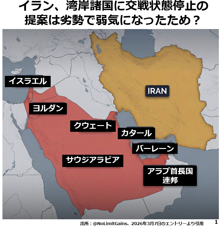 イラン側は湾岸アラブ諸国に対して「米軍、イスラエル軍による貴国領土を基地とした出撃を拒否せよ。そうすれば貴国に対する攻撃はやめる。しかし、米・イスラエル軍による出撃を容認している限りは攻撃を続ける」という提案をしたのです。図表1の交戦中諸国の地図をご覧ください。