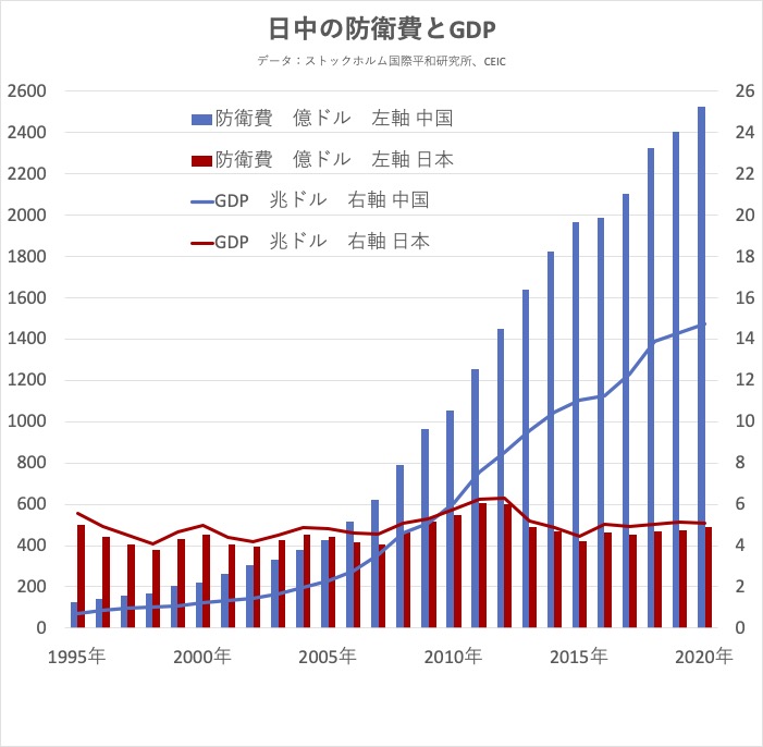 ウェブで読む(推奨):https://foomii.com/00260/2022020823185590769 //////////////////////////////////////////////////////////////// 田村秀男ウェブマガジン 経済がわかれば世界がわかる https://foomii.com/00260 //////////////////////////////////////////////////////////////// 25年間にも及ぶ日本のデフレーション(収縮)は物価ばかりではない。国内総生産(GDP)のみならず、防衛支出にも及ぶ。経済と軍事が二本柱である国力が衰退し続けている。なぜ、主要国の中で、日本だけが国力の空白を続けるのか、また、政官財学界とメディアに危機意識が希薄なのか。3回に分けて分析してみる。 まずはグラフを見よう。 ストックホルム国際平和研究所(SIPRI)によると、日本の軍事支出は2020年に491億ドルで1995年比1.6%減、世界銀行統計のGDPは5兆ドル余りで同8.8%減、いずれもデフレだ。中国の軍事支出は2543億ドルで同20.3倍、GDPは14.7兆ドルで同20倍、いずれも日本を圧倒している。 中国は2001年12月の世界貿易機関(WTO)加盟、さらに2008年のリーマン・ショック以降、経済成長に弾みをつけ、それを上回る速度で軍事支出を拡大してきた。中国は国内市場に日米欧企業を誘引すると同時に、海外での企業買収などによって軍事と切り離せない情報技術(IT)を取得し、サイバー戦能力でも米国に対抗できるまでになった。 日本の経済・防衛萎縮は米ソ冷戦時代に築かれた政策の枠組みに起因する。1947年施行の日米安全保障条約に基づいて米国の核の傘に入り、財政均衡を重視して防衛費をGDPの1%を上限としながら経済を安定成長させる。 この「戦後レジーム」は、1990年代初頭の米ソ冷戦終結後も歴代の政権を呪縛してきた。ソ連消滅と同時期に日本では平成バブルが崩壊し、経済に激しいデフレ圧力を加えた。家計の消費意欲と企業の国内投資意欲が減退しても、政府は財政均衡にこだわり続け、緊縮財政と消費税増税を繰り返して経済をゼロ%成長軌道にとどめ、防衛費の1%枠も放置された。 拙論は1月下旬に元陸将の安全保障戦略家の渡部悦和氏との対談本「経済と安全保障」(育鵬社刊)を上梓した。渡部氏が引用したレイ・クライン博士の「国力方程式」は評論家の宮崎正弘氏によれば「国際政治学のアインシュタイン理論」と高く評価されているという。方程式は「P=(C+E+M)x(S+W)」というもので、Pが国力、Cは人口+領土、Eが経済力、Mは軍事力で数値データ測定できる。S=国家戦略目標、W=国家意思は測定不能だが、日本では国家意思とは戦争放棄の憲法に明文化された戦後レジームに根ざす。言い換えると、GHQ(連合国最高司令官総司令部)体制が構築した緊縮財政と最小限の軍備を日米安保で補強した平和主義ということになるのだろう。 GHQ(連合国最高司令官総司令部)マッカーサー最高司令官は日本を2度と戦争を起させないとする決意のもと、日本の戦前、戦時の経済体制の解体による経済の「民主化」と戦争放棄、戦力不所持の「平和憲法」を押し付けたばかりではない。新憲法の1947年とともに施行されたのが財政の基本法、財政法である。同法が平和憲法と一体であることを折りに触れ指摘するのが日本共産党の機関紙「しんぶん赤旗」と朝日新聞である。赤旗は2008年4月24日付けで、財政法第4条が財政収支の均衡を求め、国債の発行を原則禁止していることについて、「戦前、天皇制政府がおこなった無謀な侵略戦争が、膨大な戦時国債の発行があってはじめて可能であったという反省にもとづいて、財政法制定にさいして設けられたもので、憲法の前文および第9条の平和主義に照応するものです」と解説している。その根拠は財政法の起案者である平井平治氏(当時、大蔵省主計局法規課長)の解説書(「財政法逐条解説」1947年)だとし、「戦争危険の防止については、戦争と公債がいかに密接不離の関係にあるかは、各国の歴史をひもとくまでもなく、わが国の歴史をみても公債なくして戦争の計画遂行の不可能であったことを考察すれば明らかである、……公債のないところに戦争はないと断言しうるのである、従って、本条(財政法第4条)はまた憲法の戦争放棄の規定を裏書き保証せんとするものであるともいいうる」と引用している。 朝日新聞の2020年8月27日付け社説「財政法と戦後 歴史的意味を忘れるな」はこの赤旗記事とほぼ同じ部分を導入部としつつ、「財政法が例外として認めた建設国債ばかりか、禁止したはずの赤字国債すら、特例法による発行が常態化した。(略)真珠湾攻撃があった41年度の借金への依存度は56・4%(一般会計と、廃止された臨時軍事費特別会計の合算)。今年度の56・3%はこれとほぼ並ぶ」と財政法の「骨抜き」を糾弾した。そして、「国会と政府は、条文の歴史的な意味を忘れてはならない」と結んだ。 赤旗が拾い出した大蔵省幹部証言と朝日の論調は図らずもだろうが、GHQこそが憲法9条と緊縮財政をセットとし、憲法と財政双方でGDPの成長を抑え込んで日本経済の弱体化と戦力否定の防衛予算を組むように仕掛けたばかりでなく、戦後世論の大勢がそれに感化され