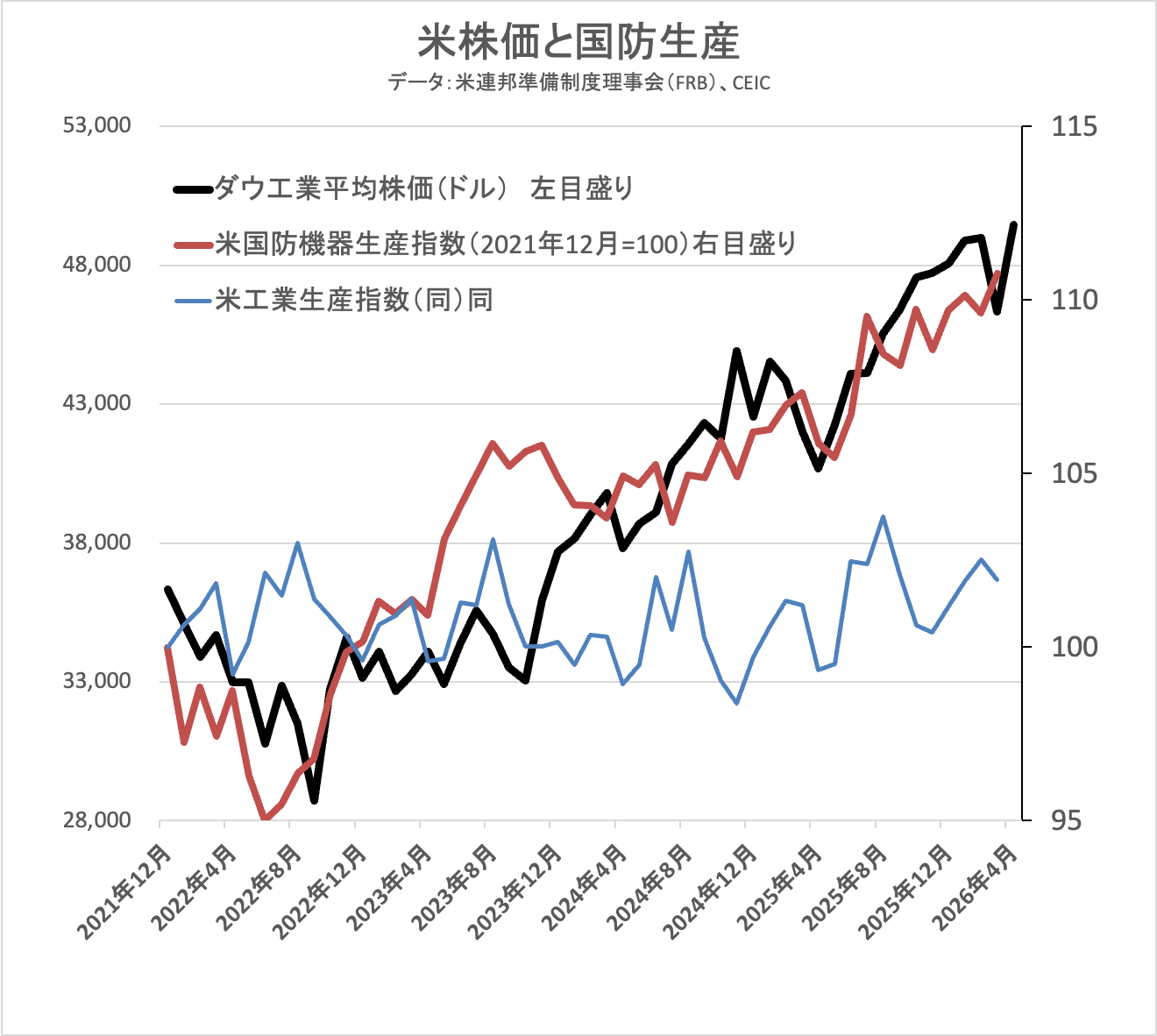 グラフは米国の工業生産指数、国防機器生産指数とダウ工業平均株価の推移である。両生産指数は2022年2月のロシアのウクライナ侵略戦争前の21年12月を100とした。株価は22年9月を底に上下の変動を繰り返しながらも上昇の趨勢を保っている。