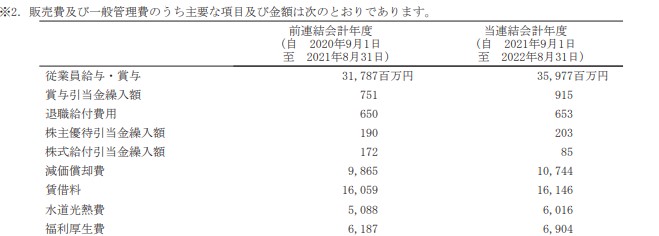 上の画像は2022年8月期のサイゼリヤの有価証券報告書から引用した資料です。