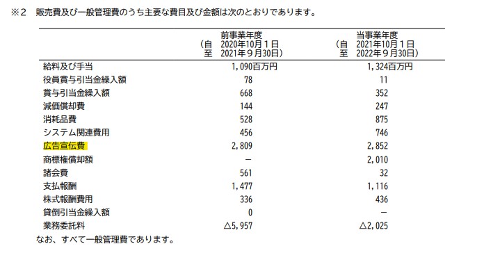 こちらは、2022年9月期のFOOD & LIFE COMPANIES(スシロー)の有価証券報告書(p.119)です。スシローは、売上高約2813億円に対して28.52億円の広告費なので、 28.52億円÷2813億円×100=約1% テレビをほとんど見ない私でも、結構CMをやっているイメージがあります。でも、売上の1%程度しか広告していないので、過度な広告ではないということが分かります。 なお、販管費、一般管理費の内訳は有価証券報告書に載っています。全ての保有銘柄で目を通すようなことはしていませんが、気になったら調べる程度です。 広告費をたくさんかけている会社のランキングも出ていますので、参考にしてくださいね。 広告宣伝費の「売上比率が高い200社」ランキング https://toyokeizai.net/articles/-/509009?page=2 *経常利益 経常利益は、本業での利益が営業利益であるのに対して、本業以外の利益や損失がある場合、計上されます。1番多いのは金利の受け取りと支払いです。他には投資先の配当金、為替差益などです。成長株投資では、営業利益と経常利益はほぼ同じくらいの企業が多いです。規模が小さい企業が多いため、本業以外で利益を生む資産が少ないからです。 また、コロナ禍では、給付金や助成金が給付された企業は営業外費用に計上され、経常利益が営業利益からかい離する企業も多くありました。営業利益と経常利益がかい離している場合は、なぜそうなっているのかを確認するようにしましょう。 *当期純利益 経常利益から、特別損失や特別利益を計上すると税金等調整前当期純利益(税引き前純利益)が出てきます。そこから法人税、住民税、事業税が利益の約4割が引かれたものが当期純利益となります。 特別損失とは、一時的な損失のことです。土地等の固定資産売却損や、有価証券売却損、災害損失などが該当します。 特別利益とは、損失の反対なので、固定資産売却益や有価証券の売却益などです。 コロナの給付金や助成金を営業外収益ではなく、特別利益に計上している企業もあります。 経常利益の6割が当期純利益となるのが普通ですが、そうでない場合は、特別損失や利益があるのか確認する必要があります。本来の利益より大きく純利益が出ている場合は、そのままで1株当たり純利益を計算すると実際より大きな数値が出て割安に見えてしまうので注意が必要です。 以上が損益計算書の解説になります。 次回はキャッシュフロー表の見方になります。今すぐ全てを理解できなくても投資はできますので、すこしずつ理解を深めてくださいね。 *参考資料 サイゼリヤ202208有価証券報告書 https://www.saizeriya.co.jp/PDF/irpdf001342.pdf FOOD & LIFE COMPANIES202209有価証券報告書 https://ssl4.eir-parts.net/doc/3563/yuho_pdf/S100PV84/00.pdf //////////////////////////////////////////////////////////////// 本ウェブマガジンに対するご意見、ご感想は、このメールアドレス宛に返信をお願いいたします。 //////////////////////////////////////////////////////////////// 配信記事は、マイページから閲覧、再送することができます。ご活用ください。 マイページ:https://foomii.com/mypage/ //////////////////////////////////////////////////////////////// 【ディスクレーマー】 本内容は法律上の著作物であり、各国の著作権法その他の法律によって保護されています。 本著作物を無断で使用すること(複写、複製、転載、再販売など)は法律上禁じられており、刑事上・民事上の責任を負うことになります。 本著作物の内容は、著作者自身によって、書籍、論文等に再利用される可能性があります。 本コンテンツの転載を発見した場合には、下記通報窓口までご連絡をお願いします。 お問い合わせ先:support@foomii.co.jp //////////////////////////////////////////////////////////////// ■ ウェブマガジンの購読や課金に関するお問い合わせはこちら support@foomii.co.jp ■ 配信停止はこちらから:https://foomii.com/mypage/ ////////////////////////////////////////////////////////////////