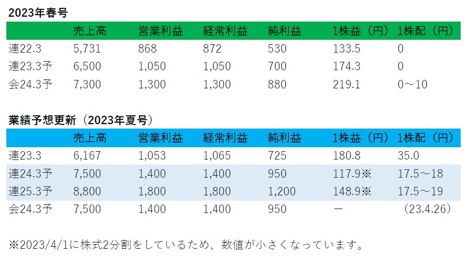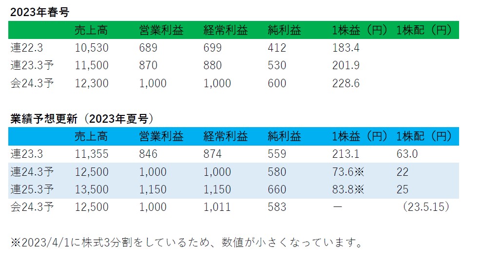 6月発売の四季報予想で、202403から202503の 営業利益が、14億→18億と 28.6%プラスの予想と更新されました。 ということは、控え目にみても、 PERが30倍くらい株価が上昇してもよいのでは? と考えることができます。 6月3日の終値3310円÷117.9円(2024031株当たり純利益)=28.1倍 5月の決算を機に上昇していますので、 今は買いタイミングではないですが、 調整したときは買いタイミングがくるかもしれません。 PERは、年率10%台の成長か、 年率10%台20%の成長かで分けて考えてみてくださいね。 ◆まとめ ・PERは、1株あたり純利益の何倍まで買われているかを表す指標 ・PERは、業種によっても違いがある ・PERが低い=よい銘柄 ではない。 ・成長の度合いによって同じPERでも、割安度合はちがう 年率成長10%程度なら、PER15倍くらいまで 年率成長20%程度なら、PER30倍くらいまで 評価されてもよいと考えることができる これらを踏まえて、四季報誌面のPERを 見てくださいね。 ・記事中の銘柄は推奨銘柄ではありませんので、投資判断は必ずご自身でお願いします。 ・私自身も相場と向き合いながら取引しています。Kindleなどでお伝えしている通りにできないこともありますことをご了承ください。 ・週3回の配信で私ひとりで執筆、確認、配信作業をしています。作業コスト削減のため、許容範囲での誤字脱字があることをご了承ください。 ・ご質問、感想はこのメールにこのまま返信お願いします。お気軽にお問合せください。個人情報に配慮した上で掲載させていただきます。 //////////////////////////////////////////////////////////////// 本ウェブマガジンに対するご意見、ご感想は、このメールアドレス宛に返信をお願いいたします。 //////////////////////////////////////////////////////////////// 配信記事は、マイページから閲覧、再送することができます。ご活用ください。 マイページ:https://foomii.com/mypage/ //////////////////////////////////////////////////////////////// 【ディスクレーマー】 本内容は法律上の著作物であり、各国の著作権法その他の法律によって保護されています。 本著作物を無断で使用すること(複写、複製、転載、再販売など)は法律上禁じられており、刑事上・民事上の責任を負うことになります。 本著作物の内容は、著作者自身によって、書籍、論文等に再利用される可能性があります。 本コンテンツの転載を発見した場合には、下記通報窓口までご連絡をお願いします。 お問い合わせ先:support@foomii.co.jp //////////////////////////////////////////////////////////////// ■ ウェブマガジンの購読や課金に関するお問い合わせはこちら support@foomii.co.jp ■ 配信停止はこちらから:https://foomii.com/mypage/ ////////////////////////////////////////////////////////////////