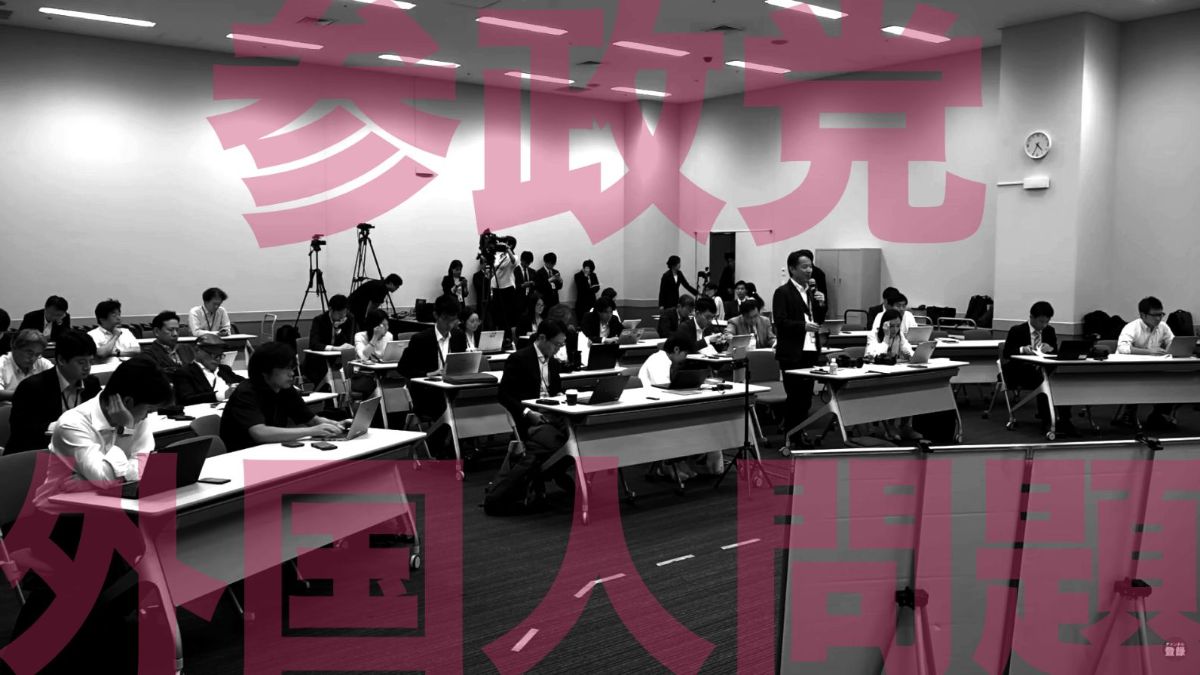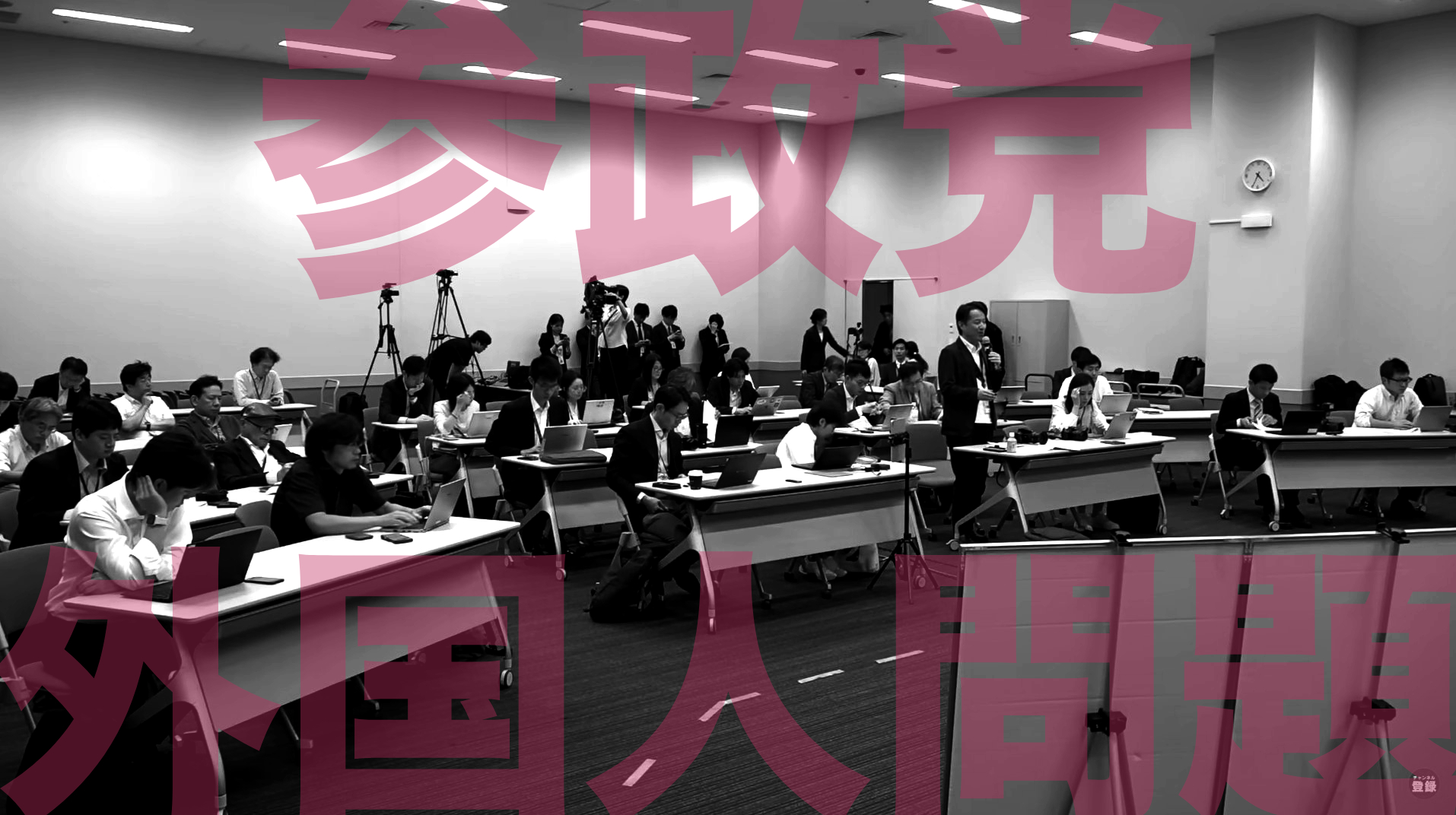 ※2025年10月1日、参政党の記者会見の様子。マイクの電波状況が悪いという理由で記者に対し起立での質問を求めたが、蓋を開ければ正面から記者の顔が見えるように撮影していた。この措置に対する事前の説明はなかった。
