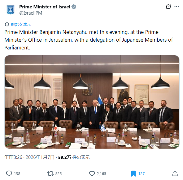 2025年1月7日、イスラエル政府は一枚のネタニヤフ首相との面会記念写真を旧Twitter「X」に投稿した。