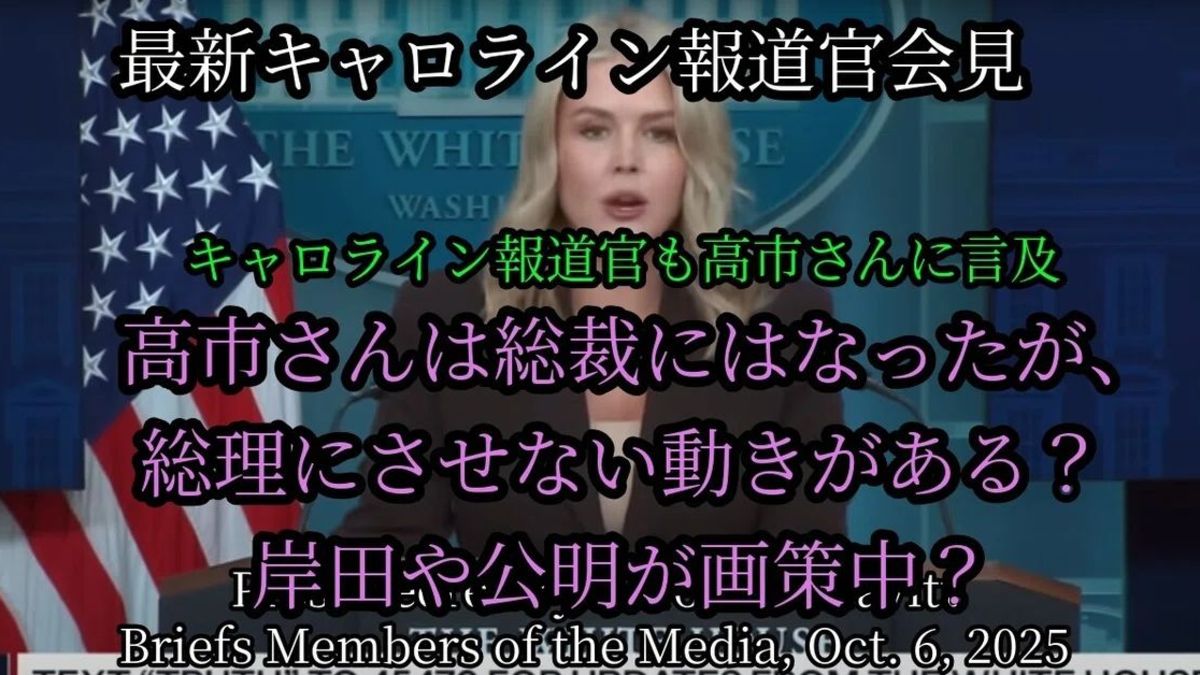 … … …(記事全文12,791文字)最新キャロライン報道官会見。キャロライン報道官も高市さんに言及。もしかしたら日本の政界に高市総理誕生阻止の動きがあるのかもしれない。高市さんは総裁にはなったが、総理にはさせないと目論む勢力がいるのかもしれない。