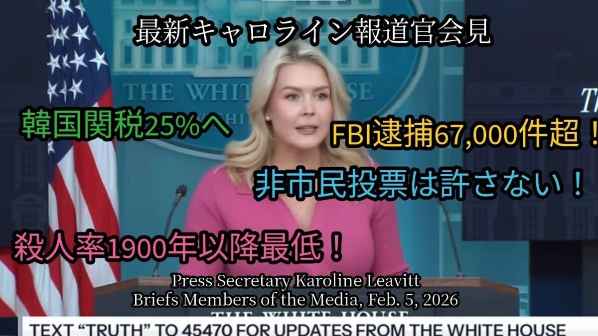 … … …(記事全文19,318文字)2026年2月5日、ホワイトハウス報道官キャロライン・リービットによる定例ブリーフィングが行われた。この会見では、トランプ政権の「法と秩序」政策がもたらした2025年の劇的な犯罪率低下が詳細に報告され、殺人率の歴史的急落やFBIの逮捕実績、国境ゼロ解放の継続などがデータとともに強調された。また、同日夜に予定されるTrumpRx.govの正式ローンチが予告され、医療費削減の新イニシアチブへの期待が高まっている。質疑応答では移民政策、選挙安全保障、イラン外交など幅広いトピックが扱われ、政権の強硬かつ成果志向の姿勢が鮮明に表れた。