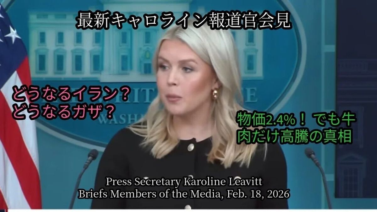… … …(記事全文20,502文字)2026年2月18日、ホワイトハウス報道官キャロライン・レヴィットが定例記者会見を行い、トランプ政権の経済成果と外交進展を強くアピールした。