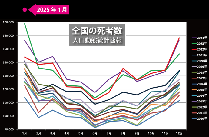 … … …(記事全文1,768文字)先日厚生労働省が発表した今年1月の人口動態統計速報は、さらに凄いことになっている。死亡者数17万8千人は前年同期比13.9%の大激増だ。