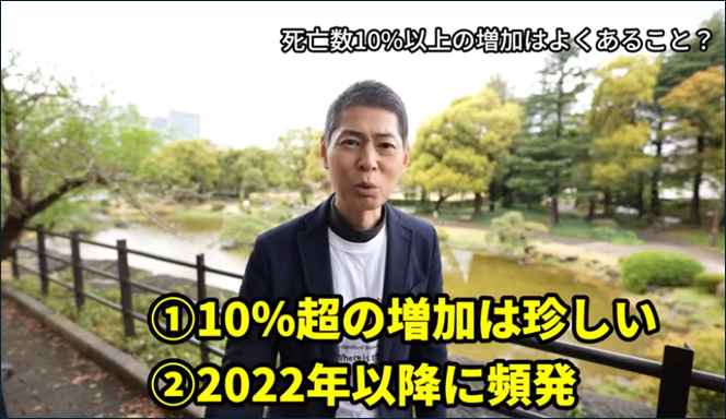 これに対し、ワクチン開始以降の前年同期比10%超えは、2022年2月、3月、8月、12月、2023年1月、そして2025年1月と、2022年以降に頻発している。死者数の異常増加は誤魔化しようがないレベルだ。