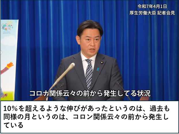 藤江氏は4月1日の厚生労働大臣記者会見でこの異常な増加について見解を求めたが、福岡大臣は「過去にも前年同期比10%を超える月はあった」と、まるで特別なことではないという風に回答した。