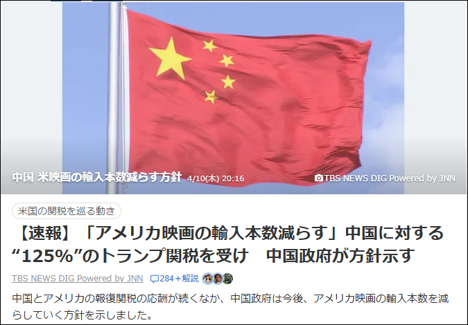 日本を始め世界各国はトランプの強硬姿勢に怖気づいて我先にと交渉を求めているが、その中で唯一、真っ向反発したのが中国だ。中国はトランプの高関税に対する報復措置として米国製品に84%の追加関税発表した。するとトランプも負けじと対中関税を125%に引き上げ、中国がハリウッド映画の輸入本数を減らすと発表すれば、米国は145%に再び引き上げるなど、報復合戦がヒートアップしている。