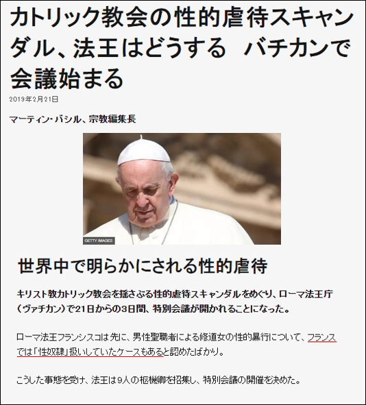 <2019年2月9日AFP「聖職者が修道女を性奴隷に、児童虐待問題で揺れる教会に新たな打撃 バチカン」>