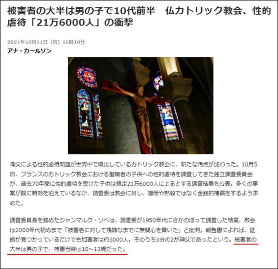 2021年10月5日日経「仏カトリック性虐待33万人 聖職者3000人が未成年らに」