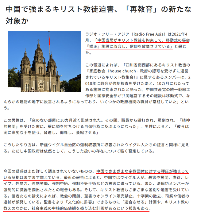共産主義国が宗教信者を弾圧するのは自明だ。神の否定は共産主義の重要なイデオロギーだからだ。中国共産党は長年イスラム教徒のウイグル族を弾圧し再教育キャンプに強制収容して思想を“再”教育したり、法輪功信者を生きたまま臓器摘出して世界中に高値で売る臓器ビジネスを隠然と行っている。無論、キリスト教信者も弾圧の対象だ。