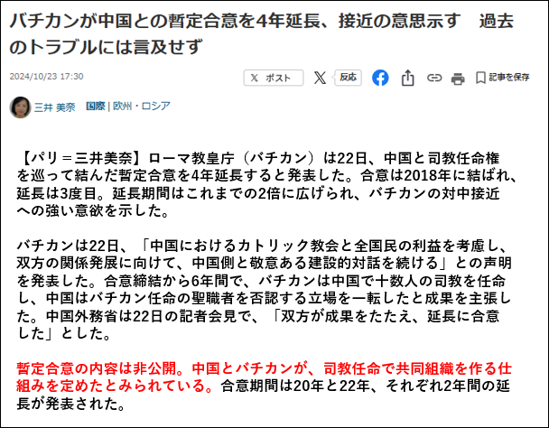 この暫定合意は2018年以来2年ごとに延長され、昨年さらに4年間延長された。暫定合意の内容は非公開だ。