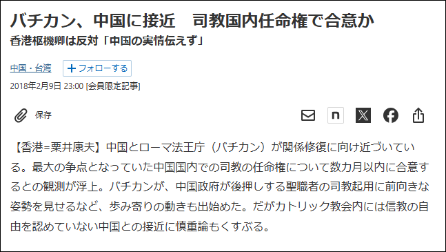 フランシスコ教皇以前、中国はローマ教皇による司教の任命権を認めず、中国共産党が統括する「中国天主教愛国会」が独自に司教を選んできた。このため中国のカトリック信者は、中国政府公認の「愛国会系」と、共産党に拒否感を示しバチカンに忠誠を誓う非合法の「地下教会系」に分かれた。そして中共は地下教会系信者を弾圧してきた。