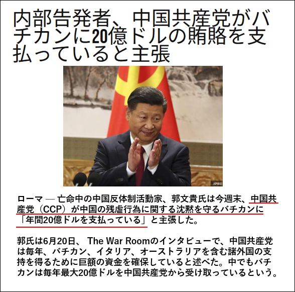 中国から米国に亡命した反中共の実業家郭文貴氏によると、バチカンは中国から毎年20億ドルを受け取っているという。それが暫定合意に含まれているかは不明だが、バチカンは20億ドルと引き換えに、中国の司教任命は勿論、信者弾圧や臓器ビジネスを黙認している可能性がある。