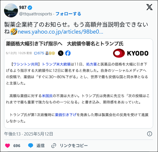 だがトランプは、米国の製造業回帰政策の一環として製薬企業の国内工場の承認審査を合理化し、期間を短縮する大統領令にも署名している。トランプは製薬企業を潰そうとしているわけではない。