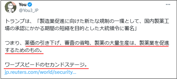 トランプの医療政策に疑問を持つ情報発信者は、医療政策に関する一連の大統領令は、第一期トランプ政権時の新型コロナワクチン開発加速政策「ワープ・スピード」作戦の二番煎じではないかと疑っている。