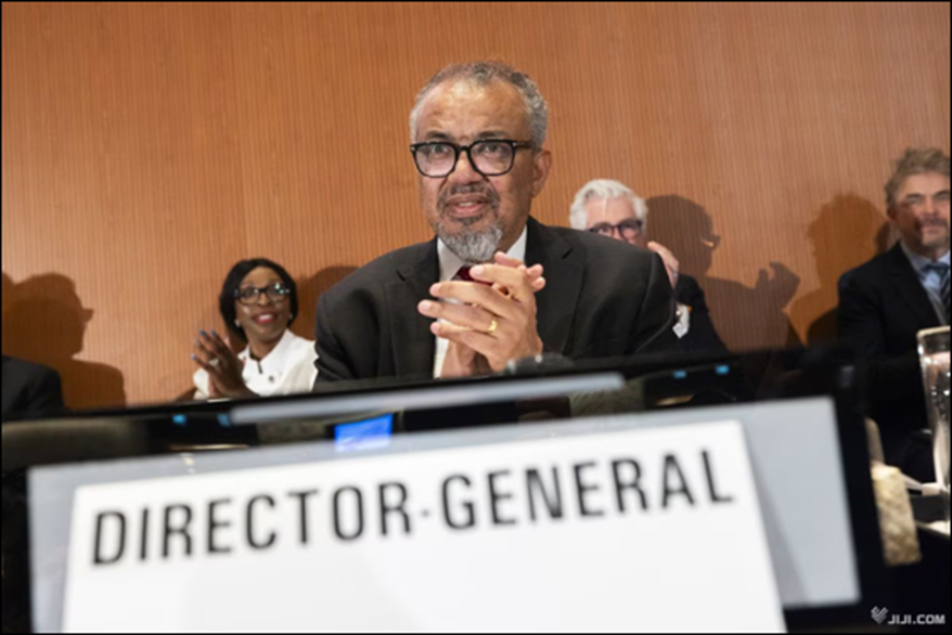 <パンデミック条約が採択され拍手するテドロス事務局長>