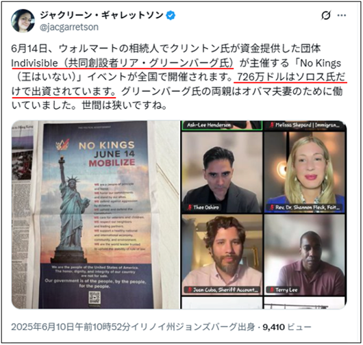 NO KINGSは、より広範な極左ネットワークのフロント組織として機能しており、既存の左翼系非政府組織(NGO)の支援を受けている。その中には、今年初めにイーロン・マスクのテスラ車を標的として失敗に終わった「カラー革命」に関与したとされる非営利団体「インディヴィジブル」や、「ヒューマン・イミグラント・ライツ・コアリション」などが含まれている。どちらもジョージ・ソロスが資金提供している団体だ。
