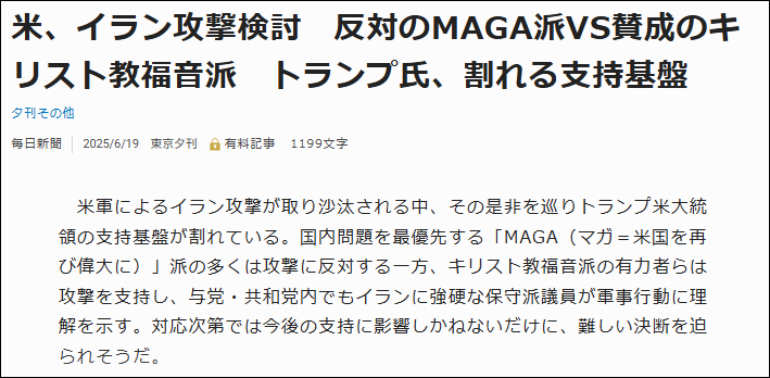 トランプはイスラエル・イラン戦争に関して対立する2つの支持勢力を維持しなければならない立場にいる。イスラエル・イラン戦争に対してトランプの言動が目まぐるしく変わるのは、トランプ一流のダブルバインド・ディールでもあるが、相反する支持勢力の支持を維持するための方便だ。