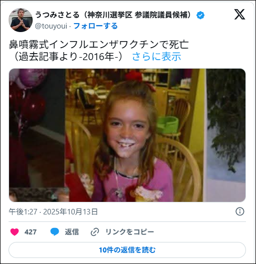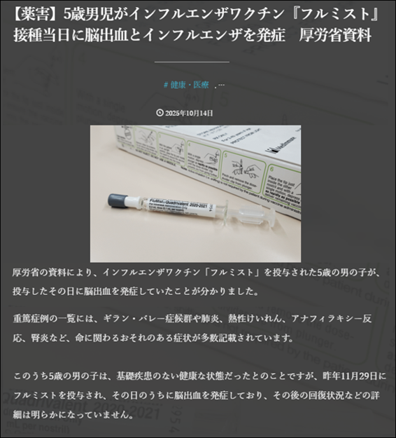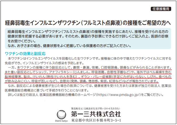 フルミストを子供に接種させる保護者は、重篤な病気を一生抱えるリスクを引き受けて接種させていることに気づいているのだろうか。