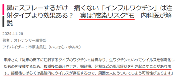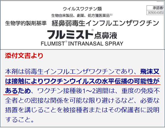 コロナワクチンのようなmRNAワクチンではないだけまだマシだが、生きたウイルスを直接鼻腔に入れるため、従来のインフルエンザワクチンよりも、そのままインフルエンザに罹るリスクが高い。