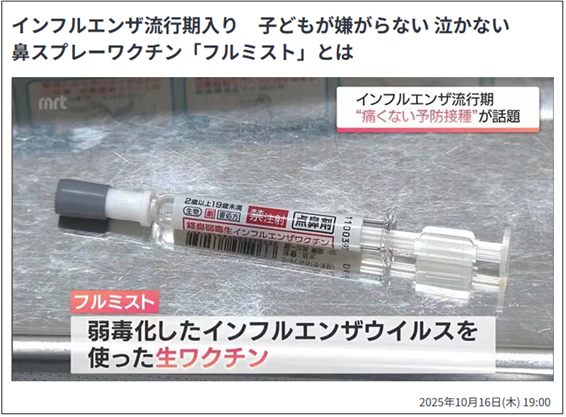 フルミストは昨年から接種が始まったワクチンで、痛みがないこと、従来のインフルエンザワクチンが「不活化ワクチン」であるのに対し「生ワクチン」なのが特徴だ。米国では大人にも使用されるが、日本では未成年(2~18歳)のみとされている。