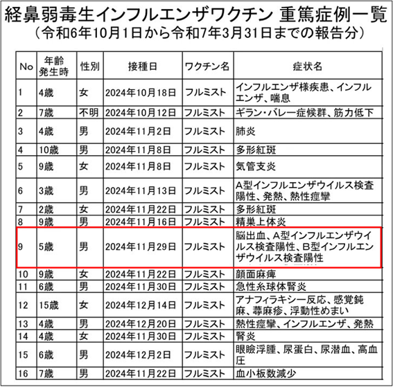 下は昨季のフルミスト接種による重篤症例だ。当然ながら全員未成年者だ。