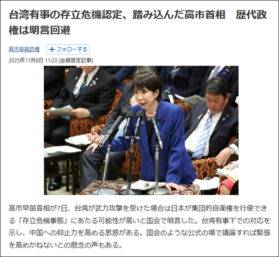 <岡田氏の質問と高市首相の仮定は「存立危機事態」に当たる>