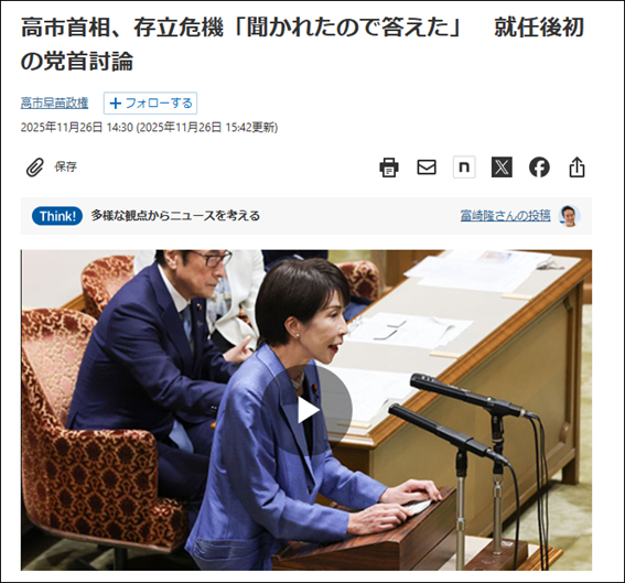 ことの発端は、11月7日の衆議院予算委員会において、立憲民主党岡田克也氏の台湾有事を絡めた集団的自衛権行使に関する質問に、高市首相が「日本の存立危機事態にあたる(集団的自衛権を行使する)」と答えたことだ。