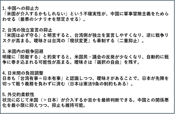 だが、中国の経済力・軍事力が増すにつれ、「戦略的曖昧さ」は中国の台湾侵攻に対する抑止力として低下しつつある。