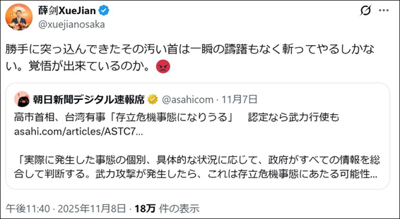 <2025年11月8日 薛剣(せつけん)駐大阪総領事Xポスト>