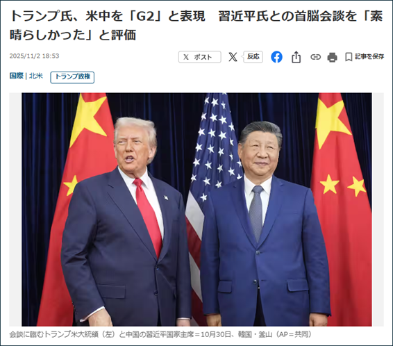 正直、トランプにとっては、日米関係よりも米中関係の方が遥かに大事だ。それは、10月30日のトランプ・習近平会談後に、トランプが自身のSNSで「G2(Group of Two)会談」と表現し、翌日のAPEC首脳会議に出席せずに帰国したことからも分かる。以前から指摘しているように、トランプは習近平とプーチンを、世界の多極化を目指す「同志」と見ている。