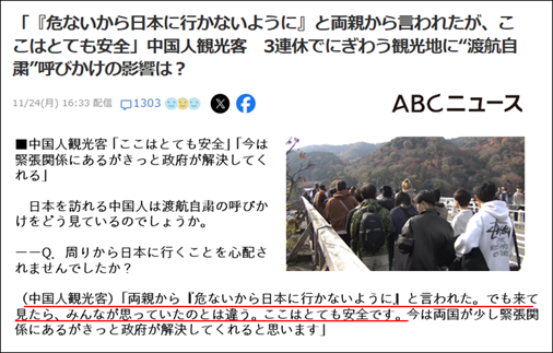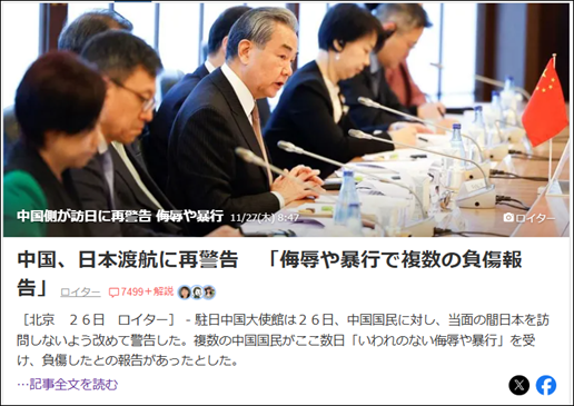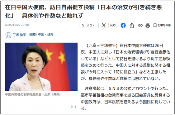 中国政府が中国人の日本渡航自粛を呼びかけた最初の理由は「高市首相の発言が在日中国人の身体や生命の安全に重大なリスクをもたらしている」だった。だが、いまは「中国人が日本人から侮辱や暴行を受け負傷している」「日本の治安が悪化している」と内容がエスカレートしている。
