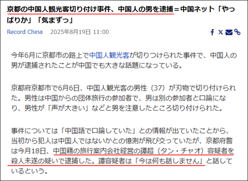 ちなみに今年6月に中国人が襲われる事件があったが、襲ったのは同胞(中国人)だった。この事件が中国側の自作自演だったとは言わないが、もしも中国人を意図的に狙った犯罪が増えるとすれば、中国側の“実績作り”の可能性を疑うべきだ。