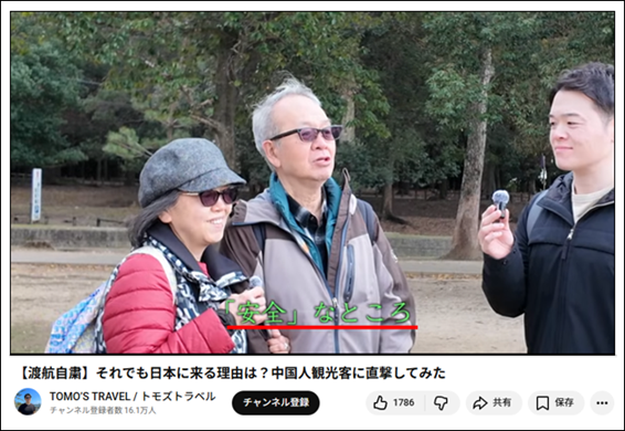 下は中国人旅行者に日本のどこが一番好きかを尋ねて回るYoutube動画の一場面だ。日本に20回以上来ている中国人夫婦は「日本のどこが一番好きですか?」という質問に対し「安全なところ」と答えている。