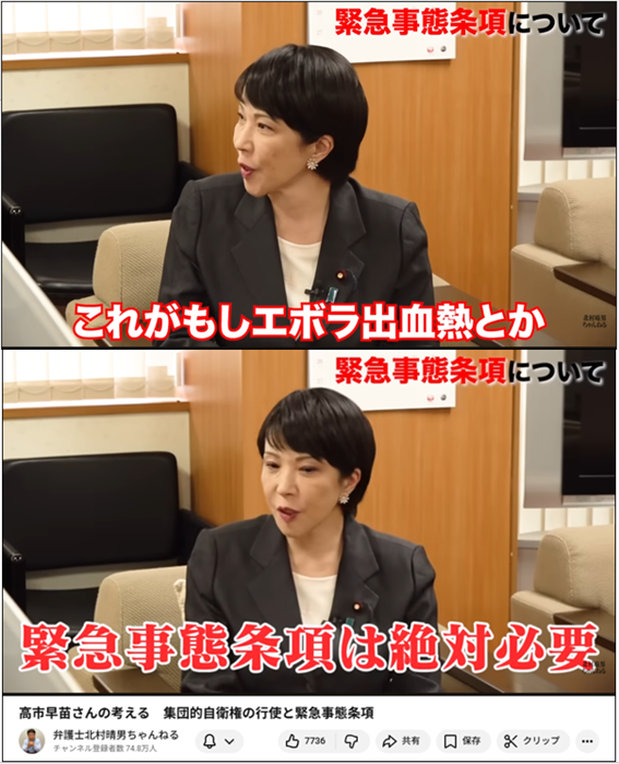 首相になる前の高市氏は、コロナ“プラン”デミックを緊急事態条項新設の根拠とした安倍元首相に倣い、エボラ出血熱“プラン”デミックを根拠としていた。