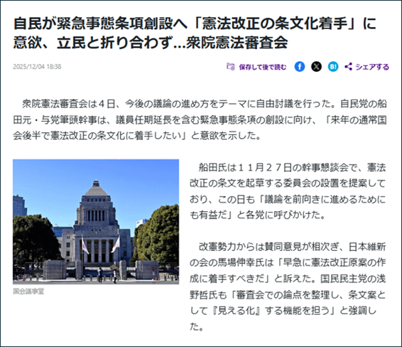 安倍路線を継承する高市首相は当然、緊急事態条項の新設に執着している。