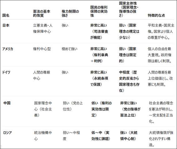 憲法の性質は国の歴史や政治体制によって大きく異なる。例えばドイツは国民の権利保障も強いが国家秩序も重要視する「両立型」だ。ロシアや中国など社会主義・共産主義国家は、「国家の安定・指導」が優先され国民の権利は二次的だ。中東諸国はイスラム法(シャーリア)を最高法規とする国が多く、憲法がない、あるいは憲法があってもイスラム法が上位に置かれる。