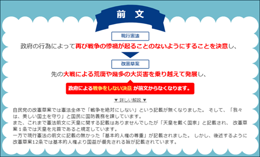 この通り、現行憲法が「恒久の平和」を重視しているのに対し、自民党草案は国家の形成・成長を前面に押し出している。形式的には主権は日本国民にあるとしているが、憲法の主体が国家に変わっていることは明白だ。
