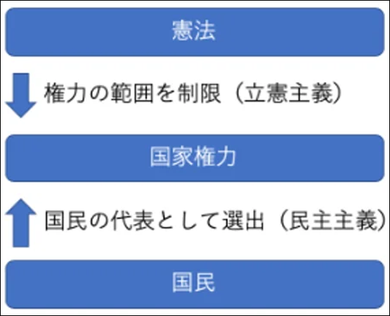日本は立憲主義(憲法による権力抑制)と民主主義(国民主権・基本的人権尊重)を組み合わせた「立憲民主制」を採用している。国家権力は憲法によって縛られ(立憲主義)、その憲法の下で国民が主権者として政治に参加する(民主主義)体制だ。