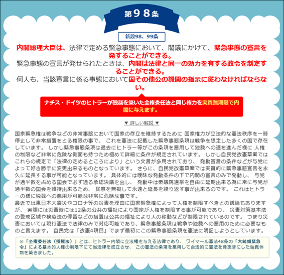 この、憲法の性質を国民主体から国家主体に変える象徴的な条項が、「緊急事態条項」(98条、99条)なのである。