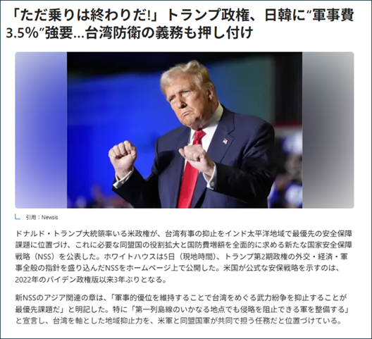 その影響を最も受けるのが日本を含む同盟国だ。トランプは第一次政権時から同盟国に対し安全保障上の自主独立を要求してきたが、今回のNSSはそのスタンスを決定的なものにした。